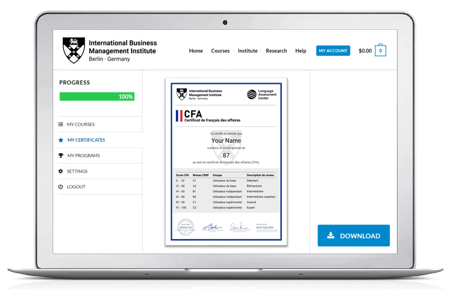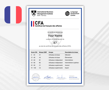 Test your business French skills and set yourself apart. Add your verified CFA certificate to your application and LinkedIn profile and get more job opportunities. You will receive your results and personal certificate immediately after our popular 45-minute test.