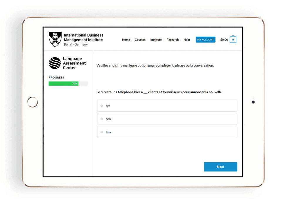 This test evaluates your business French vocabulary, grammar, comprehension and communication skills using the CFA score that is aligned to the Common European Framework of Reference for Languages (CEFR).