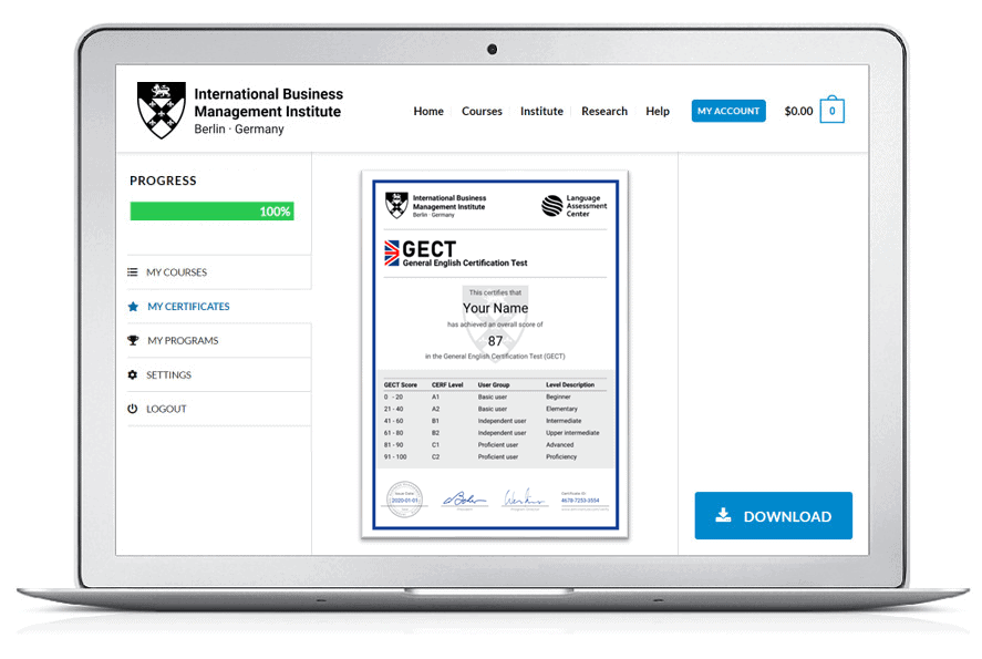 - You will receive your results and your downloadable certificate directly after the test.