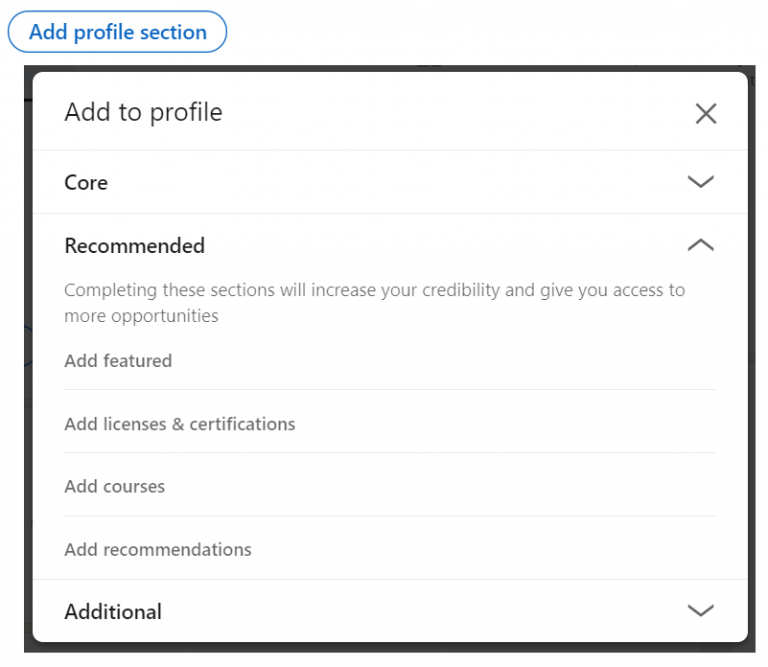 When using a desktop computer, click on “Add profile section” (below your profile photo), choose “Recommended” and then select “Add Licenses & Certifications”.