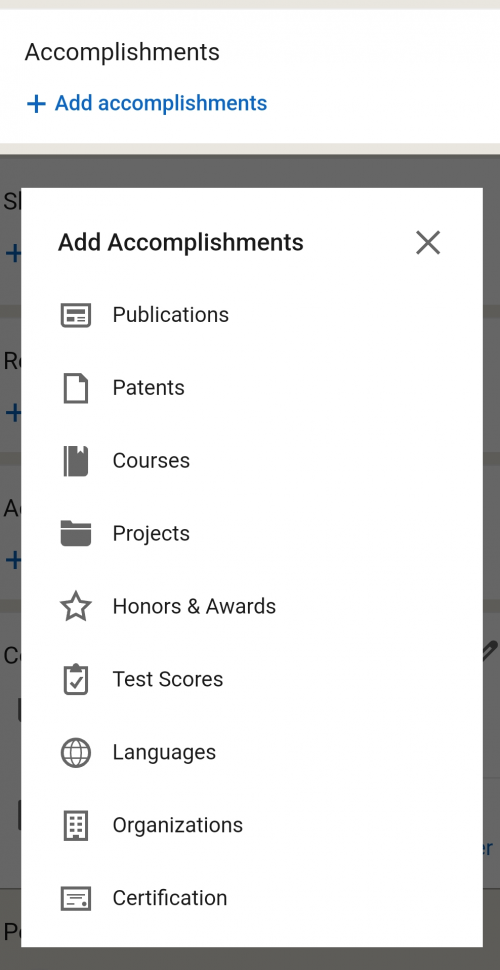 When using a smartphone, go to your profile page, scroll down until you reach the section “Accomplishments”, click on “Add accomplishments” and then select “Certification”.